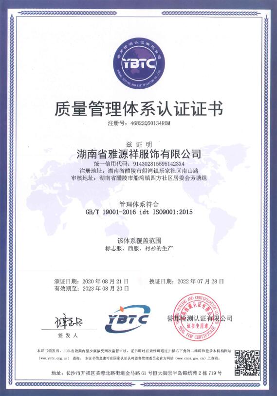 1、企業(yè)概況 湖南省雅源祥服飾有限公司地處湘贛邊境素有瓷城之稱的醴陵郊區(qū),企業(yè)創(chuàng)建于1995年,是行政執(zhí)法制服、被裝的生產(chǎn)企業(yè)。2、組織機(jī)構(gòu) 跟隨改革開放的步伐,我公司不斷發(fā)展壯大,公司董事會下設(shè)總經(jīng)理辦公室、生產(chǎn)部、技術(shù)部、質(zhì)檢部、財務(wù)部、采購部、業(yè)務(wù)部等部門,下設(shè)有流水線西服生產(chǎn)車間、標(biāo)志服生產(chǎn)車間、襯衣生產(chǎn)車間、... [更多]